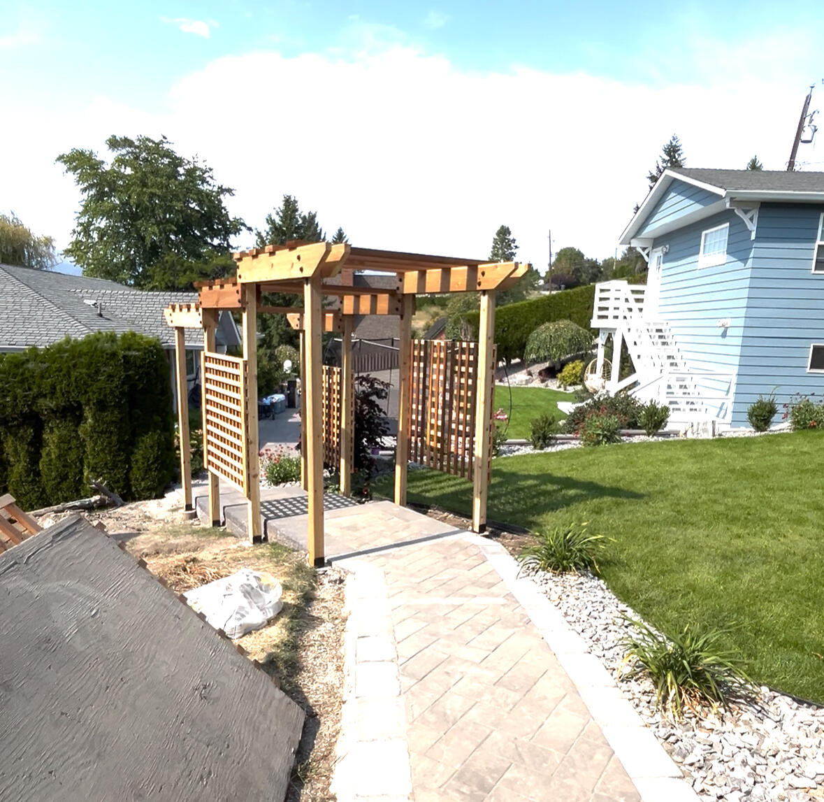 This walkway pergola was the perfect solution for privacy in this yard. Passerby's would see right down into the yard from the road so we built an aesthetic and non - intrusive way to maintain privacy. We used some rough cut cedar and weather proof hardware to make sure it stands the test of time.